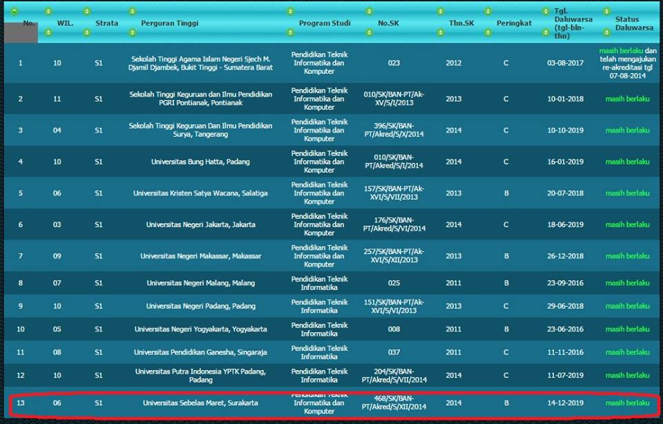 PTIK is now accredited B. Good news for all of us, especially all students and lecturers for PTIK. After going through the accreditation process in 2014, now PTIK is accredited B based on announcement from Badan Akreditasi Nasional Perguruan Tinggi (BAN-PT) certificate 468/SK/BAN-PT/Akred/S/XII/2014 and is valid until the 14th of December 2019. Hopefully, this result will motivate us more in the lecture in the coming days.