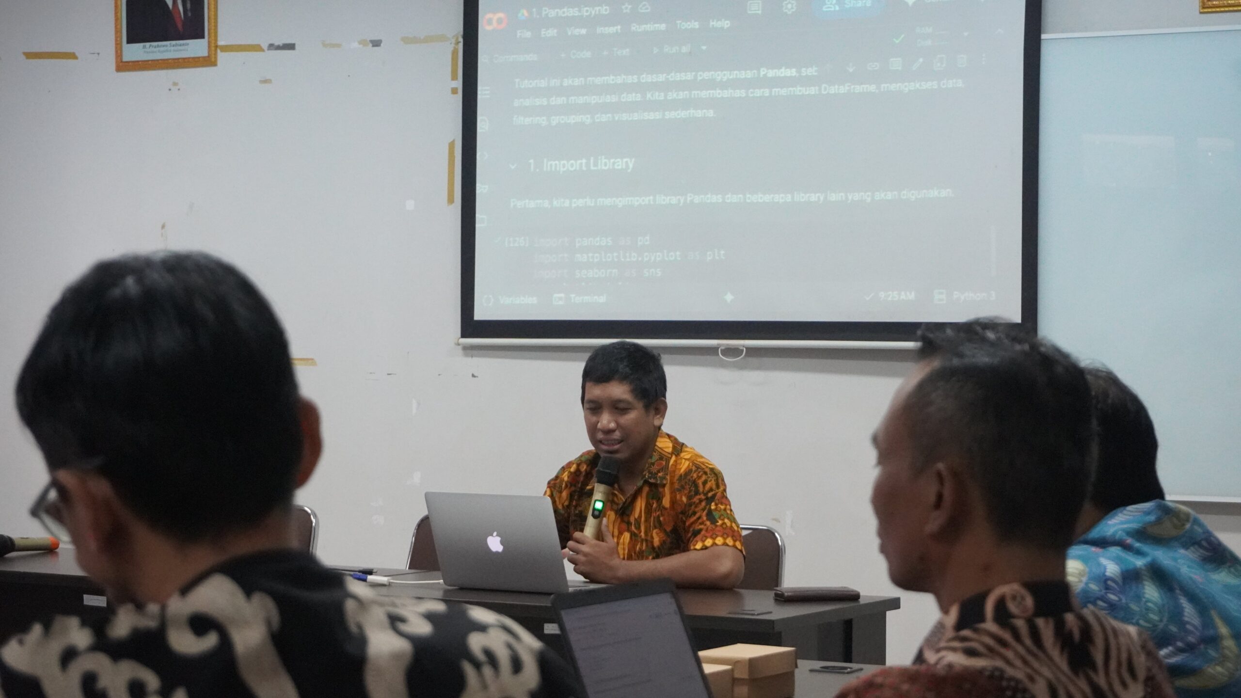 Dalam pelatihan ini para peserta diajak langsung berlatih mengolah data menggunakan pustaka populer seperti Pandas, NumPy, Matplotlib, dan Seaborn, serta mempraktikkan pembuatan proyek analisis data sederhana.